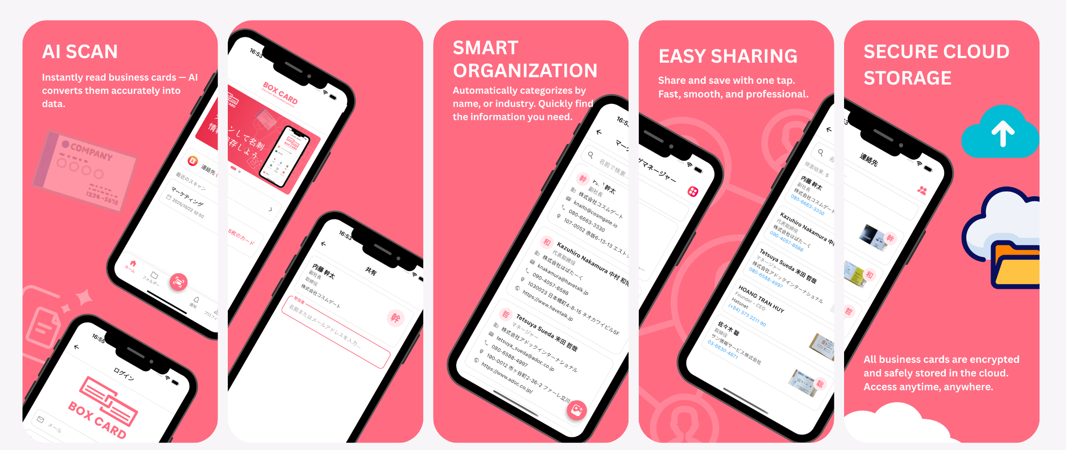 BoxCard is an AI-powered cloud business card management app developed by a Vietnamese team. Simply snap a photo of a business card with your smartphone, and the AI automatically analyzes, categorizes, and stores the information.