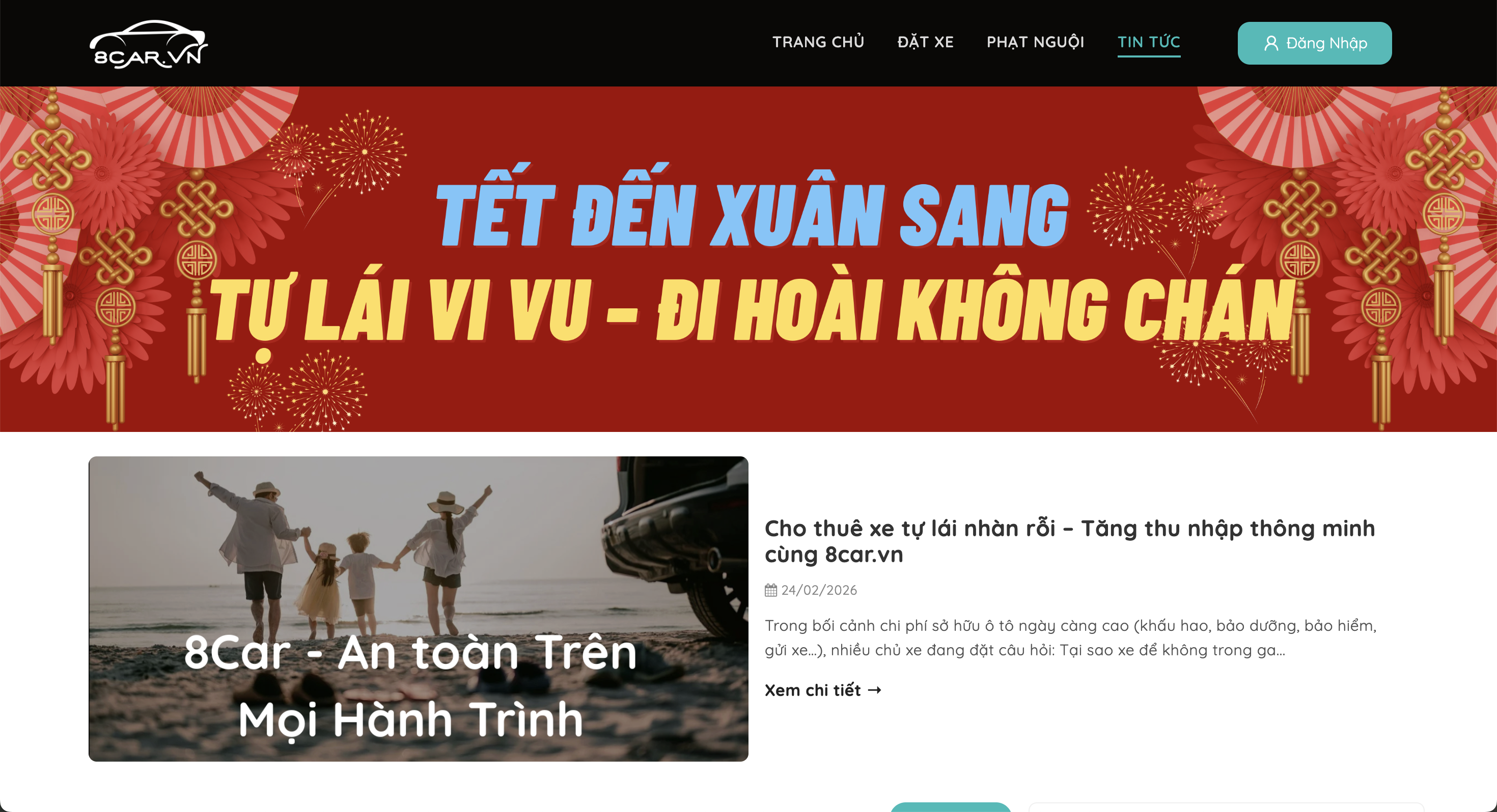Trong quá trình tìm hiểu các nền tảng thuê xe tự lái, chúng tôi có dịp trải nghiệm 8car.vn, một website kết nối giữa chủ xe cá nhân và khách có nhu cầu thuê xe tự lái. Ấn tượng ban đầu là giao diện gọn gàng, tập trung vào trải nghiệm tìm kiếm và đăng xe tương đối đơn giản.