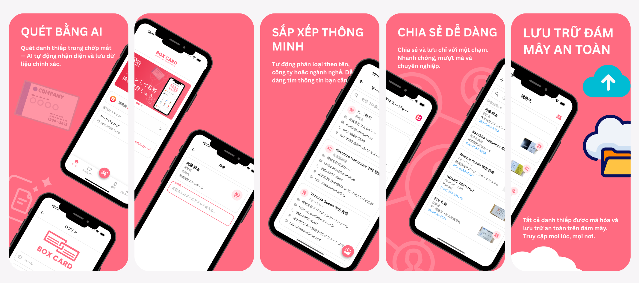 Thiết kế đơn giản, trực quan, thao tác dễ dùng cho cả cá nhân lẫn tổ chức. Chỉ cần vài bước để quét, lưu và chia sẻ danh thiếp.